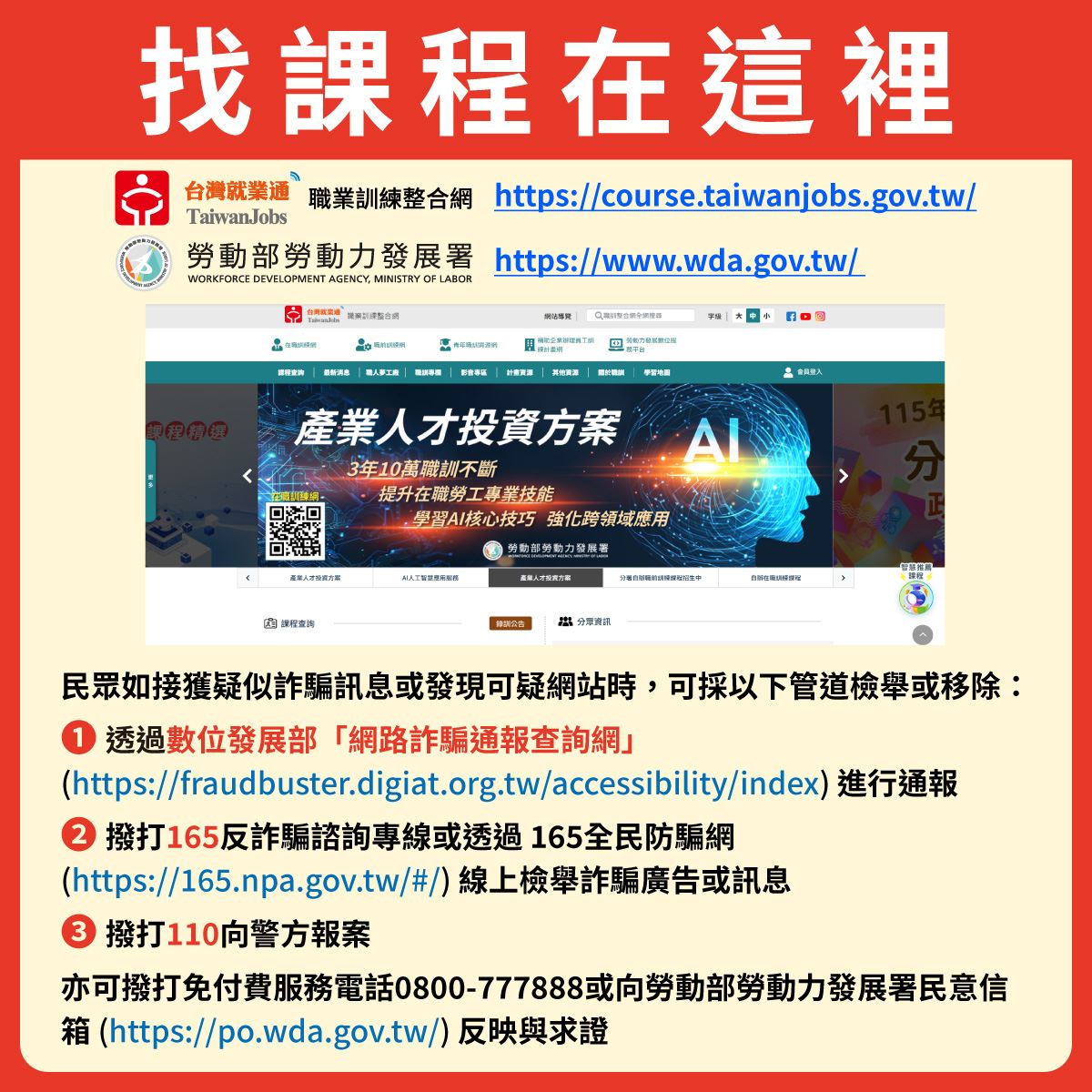 - 勞動力發展署所辦理之職業訓練課程,均以職業訓練整合網(https://course.taiwanjobs.gov.tw/)對外發布與辦理線上報名,勞動力發展署呼籲民眾,如接獲推播廣告被引導須加入群組、要求提供個人資料,請務必向勞動力發展署做進一步求證,確保自身權益。民眾可撥打免付費客服專線0800-777-888、或向勞動力發展署民意信箱(https://po.wda.gov.tw/)反映與求證。