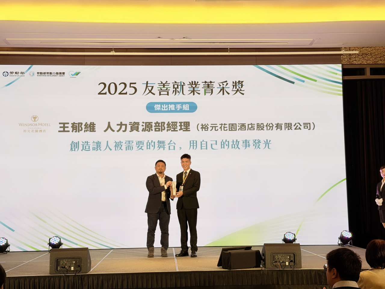 獲得傑出推手獎的裕元花園酒店人力資源部經理王郁維,以中高齡員工為核心,打造旅宿業45+友善示範。他推動回聘制度、退休晤談、中高齡友善宣導、健康職場與彈性工時,使中高齡者能以講師、顧問與技術傳承者角色重返專業舞台,更透過跨世代師徒制與文化活動促進知識流動,將友善模式向旅宿產業擴散。